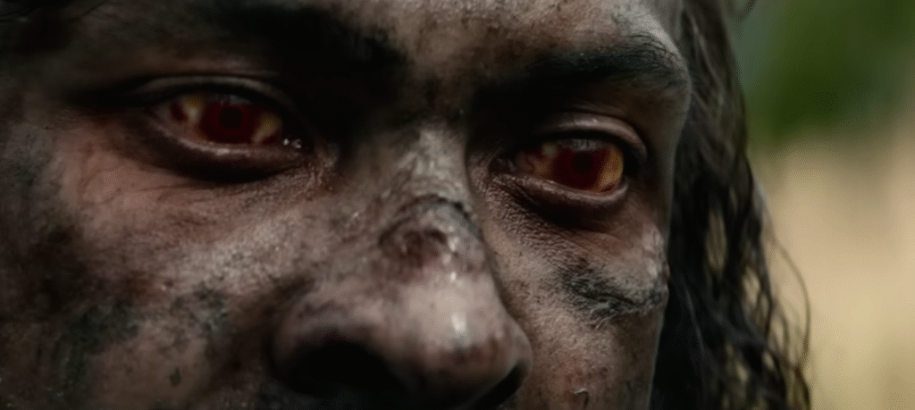 After Isla’s death, several key players return from the first film. Alfie Williams continues to excel as Spike, although he has considerably less to do here, which is a little unfortunate. Meanwhile, we spend a great deal more time with Fiennes’ Dr. Kelson, who is absolutely the MVP of this film. His bond with big-dicked Alpha zombie Samson (named for his size, strength and, presumably, girth) is both touching and intriguing. Kelson has devised a drug cocktail that keeps Samson (Chi Lewis-Parry) docile, but he starts to wonder if the rage is something that could not just be subdued, but cured. After all, this is not a supernatural film: 28 Days Later established firmly that this is a virus, and viruses can be treated. Samson may be tearing off people’s heads and viscerally eating the brains, but that doesn’t mean he’s beyond saving. After all, it’s hardly his fault; he’s a big softie at heart.